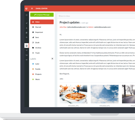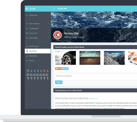 15+ ready to use pages. The UI is ready, create the functionality. Dashboard, Login, Register, Social Net, Email Center, Media Box, Invoice, FAQ, Search Results and even more. Check them all out at the live preview.