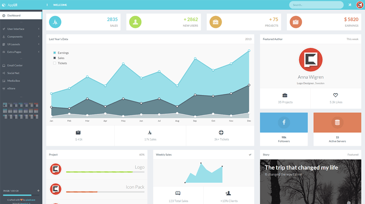 AppUI features 7 carefully chosen and integrated color themes to choose from (with 2 header & sidebar color variations each). It's like getting a new template every time you change the active color theme.